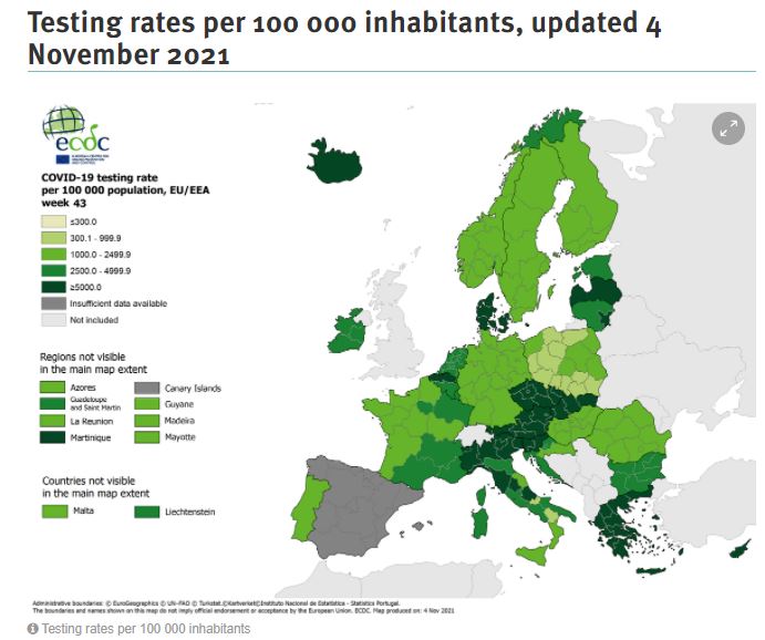 Τέλος η χώρα βρίσκεται στο βαθύ «πράσινο» όσον αφορά τον αριθμό των τεστ, με πάνω από 5.000 τεστ ανά 100.000 κατοίκους.