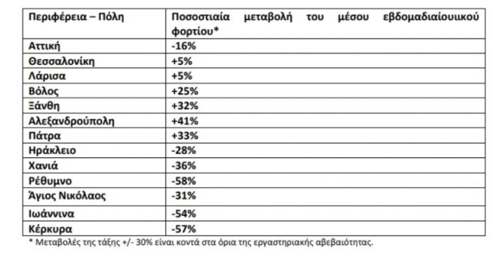 Αναλυτικά, καθαρά αυξητικές τάσεις παρατηρήθηκαν στην Ξάνθη (+32%), στην Πάτρα (+33%) και στην Αλεξανδρούπολη (+41%), ενώ οριακή ήταν η αύξηση στο Βόλο (+25%). Καθαρά πτωτικές τάσεις παρατηρήθηκαν στον Άγιο Νικόλαο (-31%), στα Χανιά (-36%), στα Ιωάννινα (-54%), στην Κέρκυρα (-57%) και στο Ρέθυμνο (-58%), ενώ οριακή ήταν η μείωση στην Περιφέρεια Αττικής (-16%) και στο Ηράκλειο (-28%).