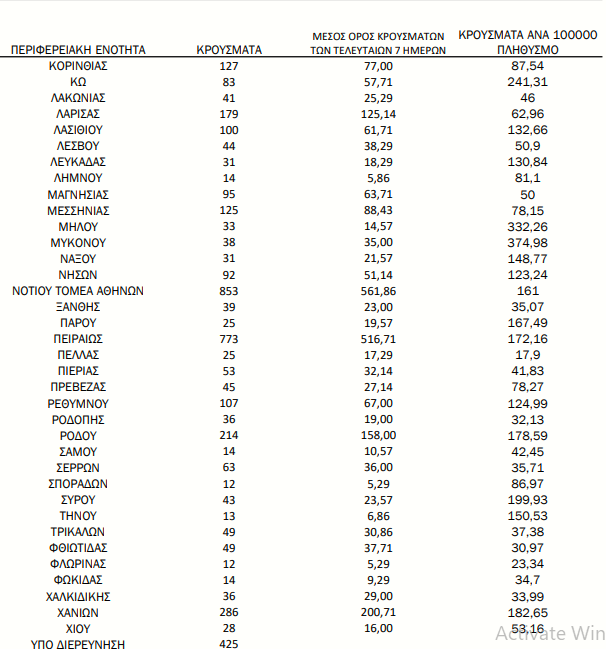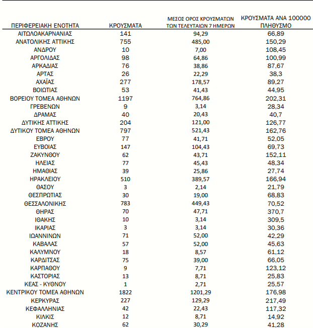 Αναλυτικά τα κρούσματα σε όλη την Ελλάδα: