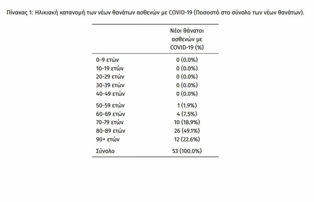 Παρόλα αυτά, ο αριθμός των 53 νεκρών σε 24 ώρες προκαλεί σοκ, καθώς οι δεκάδες απώλειες καθημερινά. Με βάση την επίσημη ανακοίνωση του ΕΟΔΥ, οι περισσότεροι συμπολίτες μας που έχασαν τη μάχη με τον ιό ήταν από 80 έως 89 ετών και συγκεκριμένα πρόκειται για 26.