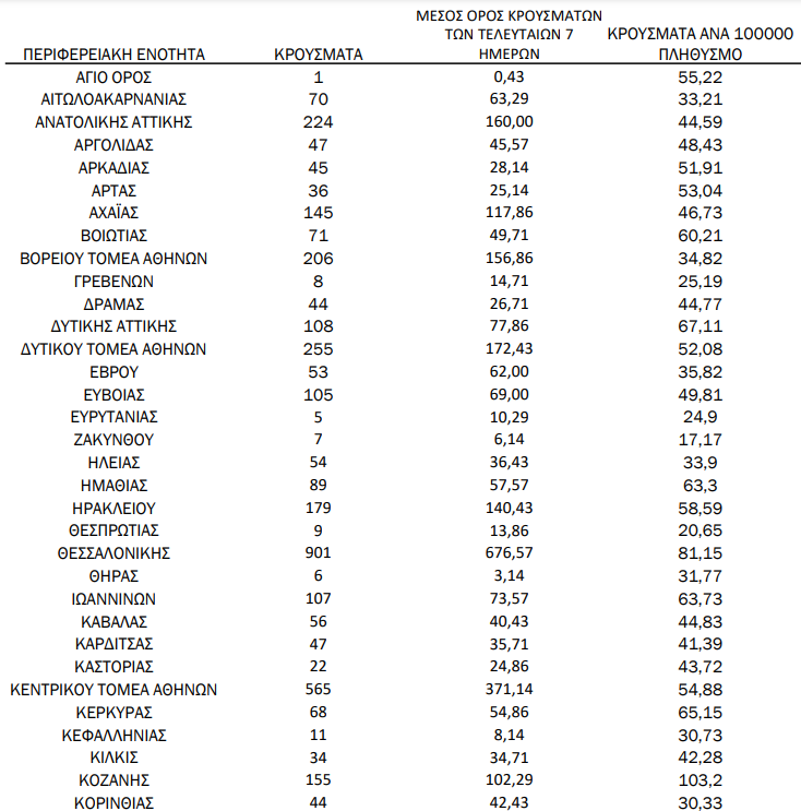 Την ίδια στιγμή, εκτός της Θεσσαλονίκης, ακόμα 10 περιοχές καταγράφουν τριψήφιο αριθμό κρουσμάτων.