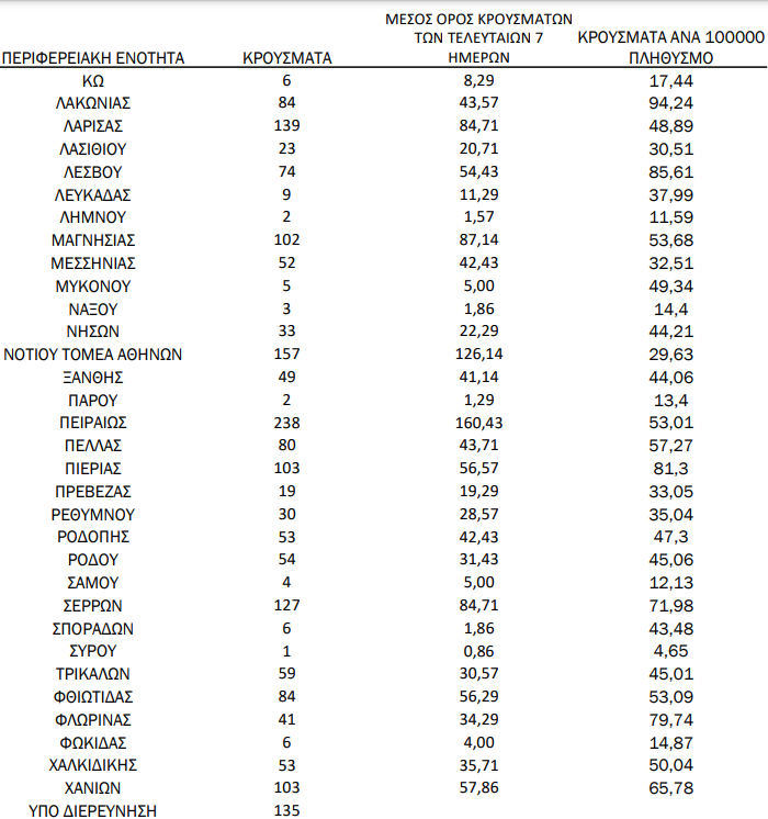 Τέλος, 135 κρούσματα βρίσκονται υπό διερεύνηση.