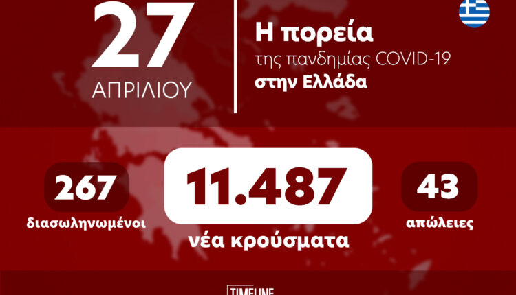 Οι νέοι θάνατοι ασθενών με COVID-19 είναι 43, ενώ από την έναρξη της επιδημίας έχουν καταγραφεί συνολικά 29.022 θάνατοι.