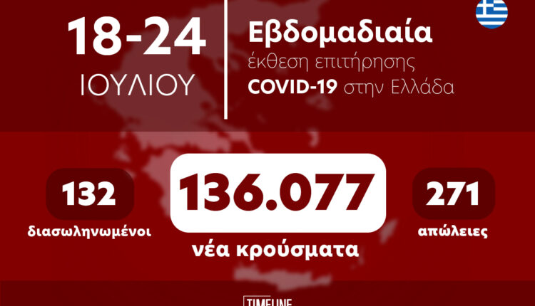 Την εβδομαδιαία έκθεση κρουσμάτων εξέδωσε ο ΕΟΔΥ που αφορά την περίοδο 18 Ιουλίου 2022 – 24 Ιουλίου 2022 Ιουλίου, σημειώνοντας ότι καταγράφηκαν 136.077 κρούσματα COVID-19 (13.044 ανά εκατoμμύριο πληθυσμού: -9% εβδομαδιαία μεταβολή) εκ των οποίων οι επαναλοιμώξεις αφορούν το 19% των λοιμώξεων.