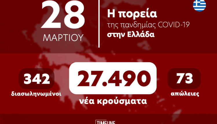 Τα νέα εργαστηριακά επιβεβαιωμένα κρούσματα της νόσου που καταγράφηκαν τις τελευταίες 24 ώρες είναι 27.490. Ο αριθμός των θανάτων ανήλθε σε 73 . Ο αριθμός των διασωληνωμένων έφτασε τους 342.