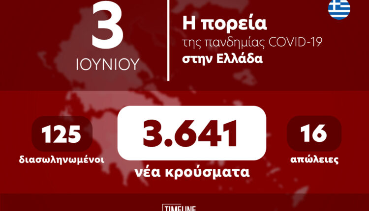 Τα νέα εργαστηριακά επιβεβαιωμένα κρούσματα της νόσου που καταγράφηκαν τις τελευταίες 24 ώρες από τον ΕΟΔΥ είναι 3.641. Ο αριθμός των θανάτων ανήλθε σε 16.Ο αριθμός των διασωληνωμένων τους 125. Ο αριθμός πιθανών νέων επαναλοιμώξεων που καταγράφηκαν τις τελευταίες 24 ώρες ήταν 440.
