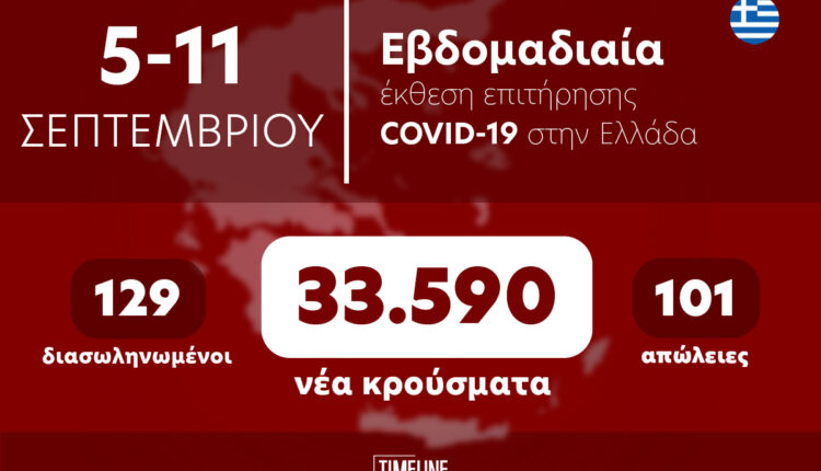 Στα 33.590 ανέρχονται τα νέα κρούσματα κορωνοϊού στην Ελλάδα, σύμφωνα με την εβδομαδιαία έκθεση αναφοράς του ΕΟΔΥ.