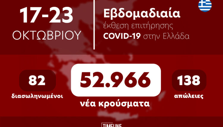 Ειδικότερα, την περασμένη εβδομάδα καταγράφηκαν συνολικά 52.966 νέα κρούσματα, ενώ 138 συνάνθρωποί μας έχασαν τη ζωή τους από τον φονικό ιό.