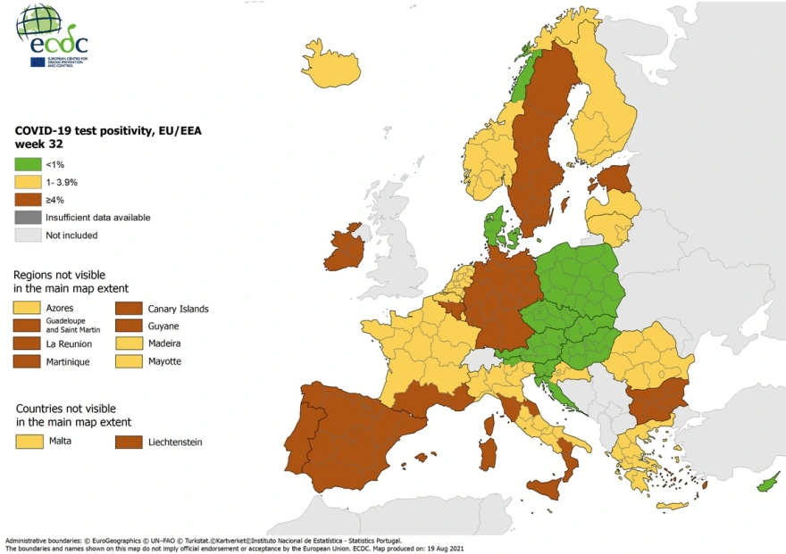 Συνεχίζει να κερδίζει έδαφος το «κόκκινο» στον επικαιροποιημένο επιδημιολογικό χάρτη του Ευρωπαϊκού Κέντρου Πρόληψης και Ελέγχου Νόσων (ECDC) που παρουσιάστηκε σήμερα, Πέμπτη, 19 Αυγούστου.