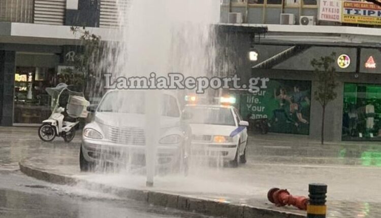 Μία πρόσκρουση ενός αυτοκινήτου με κρούνο στην πλατεία Πάρκου στη Λαμία στάθηκε αρκετή, για να αποκτήσει η πλατεία ένα νέο… συντριβάνι.