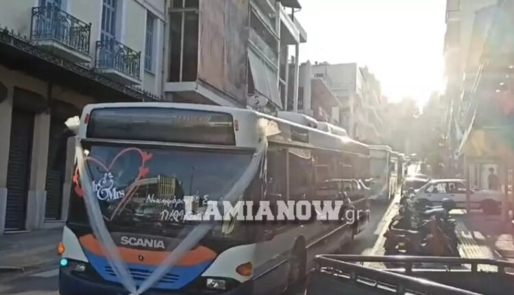 Οι συνάδελφοι του – που δεν είχαν δρομολόγια- πήραν τα λεωφορεία τους και τον συνόδευσαν στην εκκλησία κάνοντας το πέρασμα τους από το κέντρο της Λαμίας με τις κόρνες να δίνουν και να παίρνουν για το χαρμόσυνο γεγονός.