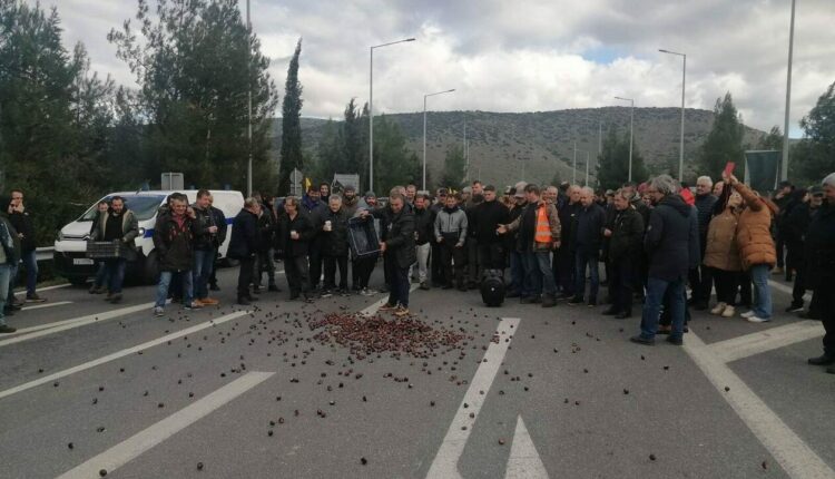 Οι καστανοπαραγωγοί έκλεισαν για μικρό χρονικό διάστημα τον δρόμο στο κόμβο Γυρτώνης και σκόρπισαν κάστανα στο οδόστρωμα.