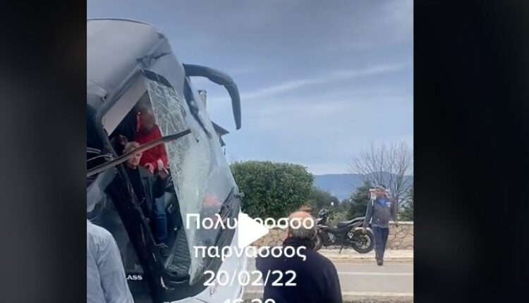 Ατύχημα σημειώθηκε στον Πολύδροσσο στον Παρνασσό το απόγευμα της Κυριακής. Σύμφωνα με βίντεο που κυκλοφόρησε στο TikTok, ο οδηγός λεωφορείου έχασε τον έλεγχο και το όχημα ξέφυγε από τον δρόμο και εγκλωβίστηκε στο πλάι. Οι επιβάτες δεν μπορούσαν να κατέβουν από το όχημα και έτσι χρειάστηκε να σπάσουν το παμπρίζ και να βγούν από εκεί.