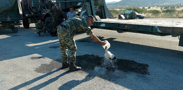 Η στιγμή που ένας μικρός πελαργός, καμένος στα πόδια, δέχεται τη φροντίδα ενός στρατιωτικού στον διάδρομο αποπροσγείωσης στο αεροδρόμιο του Πολυχνίτου εντυπωσιάζει.