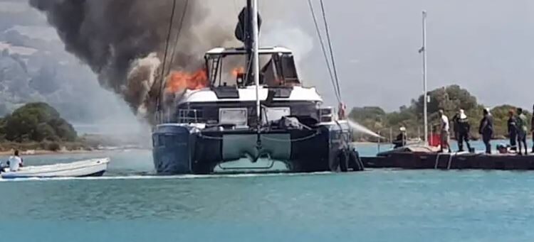 Στις φλόγες τυλίχτηκε το μεσημέρι του Σαββάτου καταμαράν στο λιμάνι της Λευκάδας.
