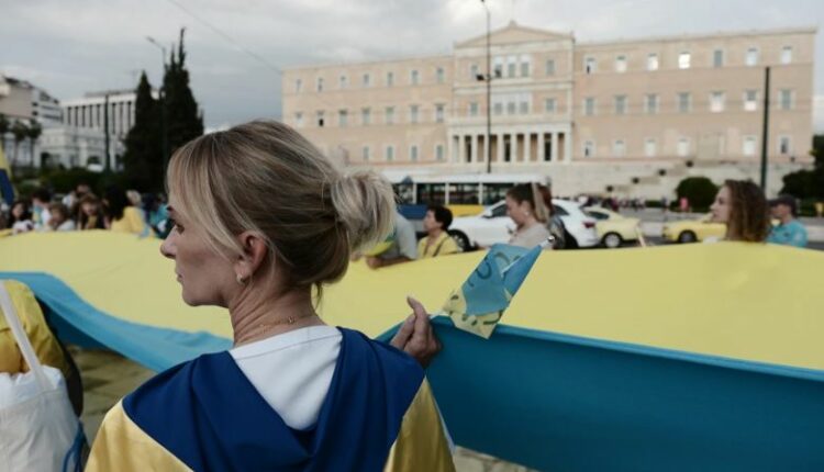 Ουκρανοί πολίτες που διαμένουν στην Ελλάδα και όχι μόνο κρατούν ουκρανικές σημαίες αλλά και πλακάτ με συνθήματα για μπει τέλος στον αιματηρό πόλεμο.
