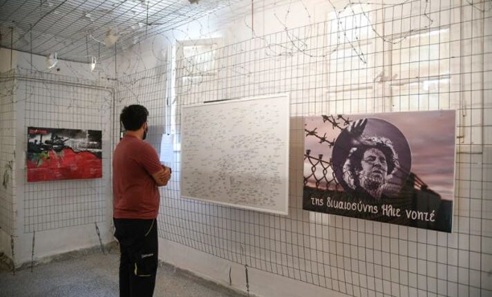 Φωτογραφίες του Μίκη και δημοσιεύματα της εποχής έχουν αναρτηθεί στους τοίχους.
