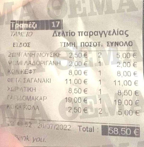 Δυο άτομα, λοιπόν, πλήρωσαν 58,5 ευρώ για το φαγητό τους και, όταν ζήτησαν τον λογαριασμό, ο σερβιτόρος τους έφερε το δελτίο παραγγελίας, όχι όμως και την απόδειξη.