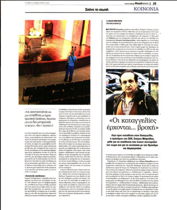 “Πήρα την απόφαση να μιλήσω μετά από τριάντα χρόνια γιατί πρέπει άνθρωποι σαν κι αυτόν, οι οποίοι εκμεταλλεύονται την επιτυχία και τη θέση ισχύος που αποκτούν προκειμένου να ικανοποιήσουν τις ερωτικές τους ορέξεις, να τιμωρούνται παραδειγματικά. Και κοπέλες σαν εμένα, που έχουν υποστεί την ίδια η παρόμοια συμπεριφορά, πρέπει να βρουν το θάρρος να υπερασπιστούν τον εαυτό τους” δηλώνει φανερά αναστατωμένη η Χριστίνα Ζ. στη Realnews, εξιστορώντας το συμβάν όπως ακριβώς περιγράφεται και στην κατάθεσή της στο ΣΕΗ.