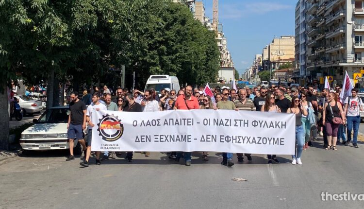Η διαμαρτυρόμενοι φωνάζουν συνθήματα κατά της Χρυσής Αυγής και κρατούν πανό. Μεταξύ άλλων αναγράφεται: “Ο λαός απαιτεί οι ναζί στη φυλακή. Δεν ξεχνάμε, δεν εφησυχάζουμε”.