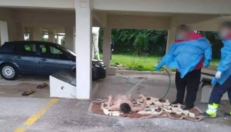 Οργή προκαλεί η εικόνα που έρχεται από τον Ωρωπό με τους νοσηλευτές να ρίχνουν νερό με λάστιχο σε γυμνή γυναίκα, πάνω σε μια κουβέρτα.