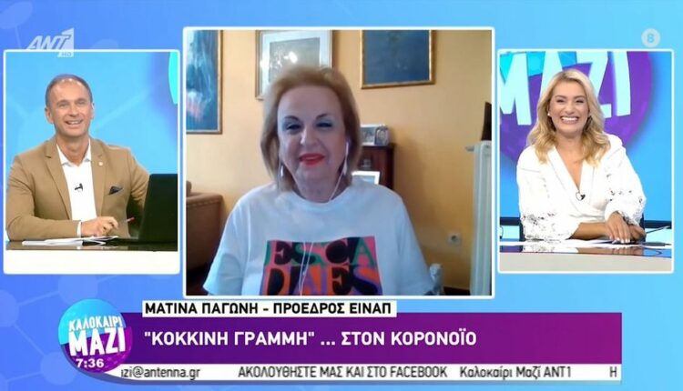 Η Πρόεδρος της ΕΙΝΑΠ, Ματίνα Παγώνη, μιλώντας στon ANT1, τόνισε ότι ακόμη και τώρα που είναι καλοκαίρι θα πρέπει να φοράμε την προστατευτική μάσκα όπου υπάρχει συνωστισμός, κάτι που δεν κάνει η πλειοψηφία των τουριστών που έρχονται στη χώρα μας.