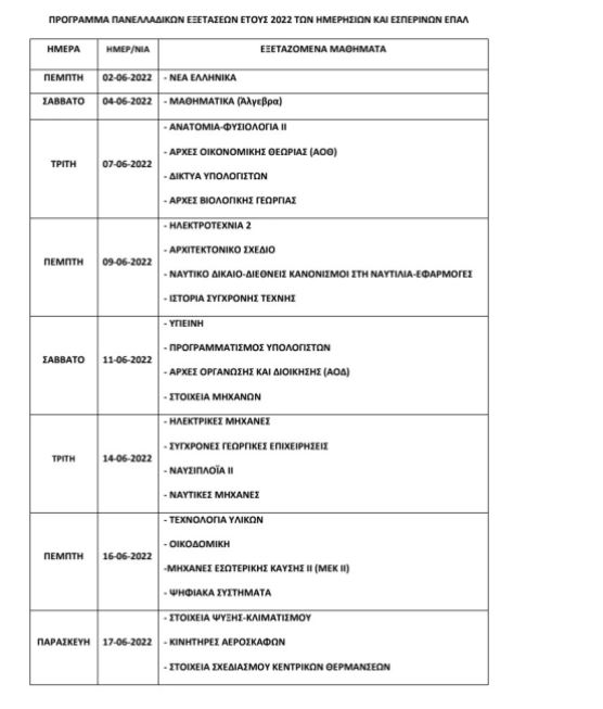 – Έναρξη πανελλαδικών εξετάσεων ημερήσιων και εσπερινών γενικών λυκείων: 3 Ιουνίου 2022