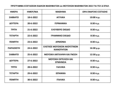 Τα ειδικά και μουσικά μαθήματα για τους υποψηφίους των ΓΕΛ και των ΕΠΑΛ θα διεξαχθούν από τις 18/6 (Αγγλικά) έως τις 30/6 (Ιταλικά).