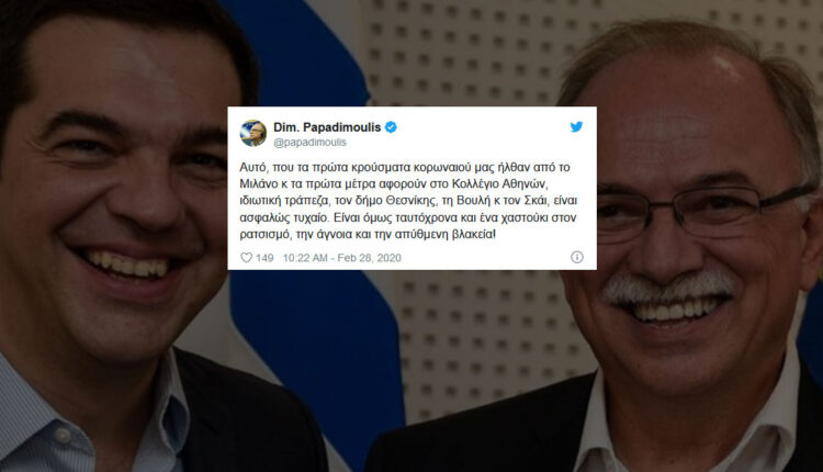 Με ένα tweet ο Ευρωβουλευτής του ΣΥΡΙΖΑ σχολίασε το ότι τα μέρη στα οποία εμφανίστηκαν τα πρώτα κρούσματα του κορωνοϊού είναι χαστούκι στο ρατσισμό, την άγνοια και τη βλάκεια.