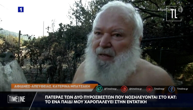 Η μαρτυρία του στην εκπομπή «Από τις έξι» στην ΕΡΤ συγκλονίζει: «Το ένα παιδί μου χαροπαλεύει στην εντατική. Ο άλλος είναι σε θάλαμο με σοβαρά εγκαύματα στα δύο χέρια. Χθες βράδυ, πήγαν εθελοντικά στις φωτιές. Δεν τραυματίστηκαν τα παιδιά στην προσπάθειά τους να σώσουν τα σπίτια τους, αλλά αμυνόμενοι με τόσους άλλους στο δάσος. Εκεί έπαθαν τη ζημιά», ανέφερε αρχικά ο Κώστας Μανιάς.