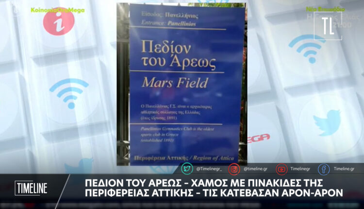 Μετά τις αντιδράσεις για τις νέες μεταλλικές πινακίδες που τοποθέτησε η Περιφέρεια Αττικής στις εισόδους του Πεδίου του Άρεως, μεταφράζοντας την ονομασία του κεντρικού πάρκου της πόλης σε… «Mars Field», παραπέμποντας στον θεό του Πολέμου Mars της ρωμαϊκής μυθολογίας και όχι στον Άρη, αυτές αντικαθίστανται.