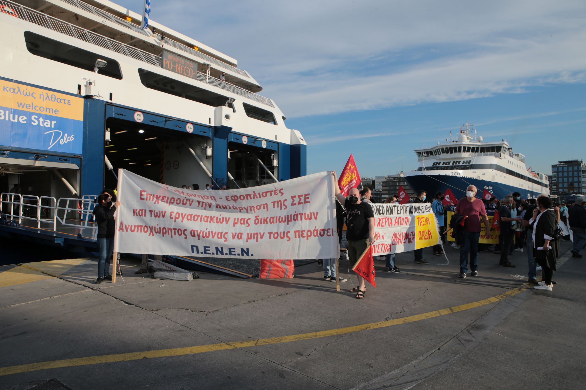 Ταξιδιώτες που είχαν συγκεντρωθεί από το πρωί στο λιμάνι για να ταξιδέψουν προς τους προορισμούς τους με τα πλοία, βρέθηκαν ξαφνικά εγκλωβισμένοι, με τα πλοία δεμένα και την είσοδό τους σε αυτά και τον απόπλου να μην επιτρέπεται, με τα μέλη της ΠΕΠΕΝ να πραγματοποιούν συγκέντρωση διαμαρτυρίας.