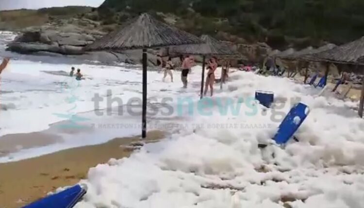 Γέμισε … αφρούς η παραλία Τηγάνια, στη Σιθωνία Χαλκιδικής, αποτέλεσμα του φαινομένου ευτροφισμού που εμφανίστηκε στη θαλάσσια περιοχή.