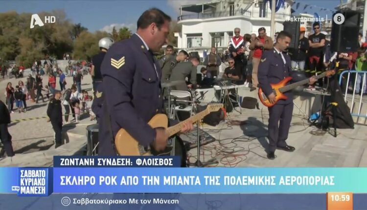Ο επισμηνίας στην ηλεκτρική κιθάρα, ο αρχισμηνίας στα ντραμς και ο σμηνίας στο μπάσο επέλεξαν ροκ νότες για την εκδήλωση εκπλήσσοντας ευχάριστα όσους βρέθηκαν στην περιοχή.