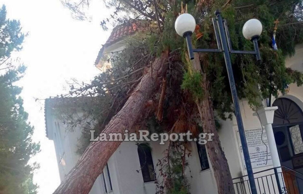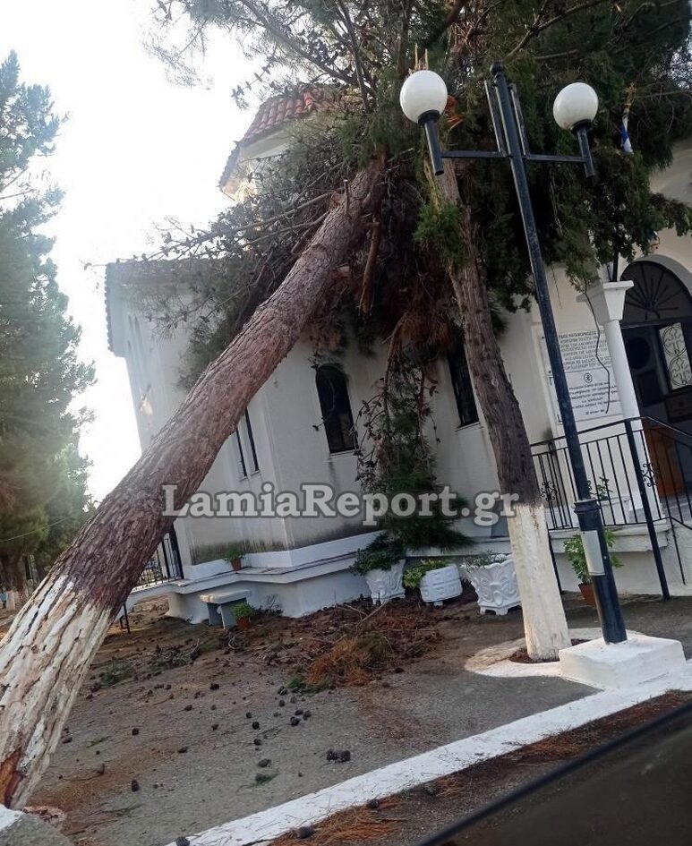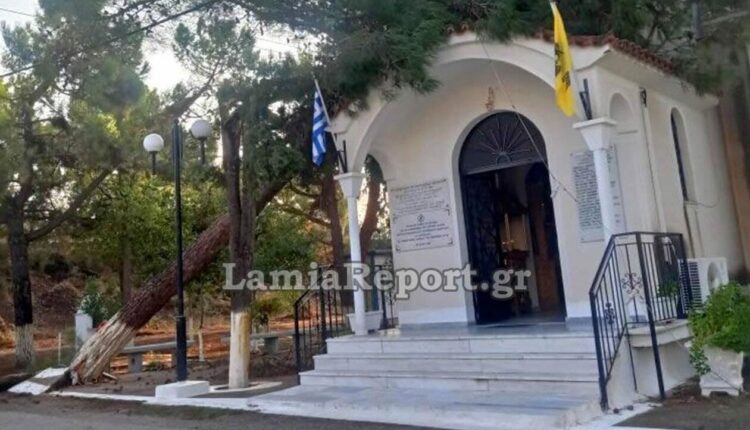Όπως βλέπετε και στις φωτογραφίες του LamiaReport το δέντρο έπεσε πάνω στο εκκλησάκι, προκαλώντας ζημιές στην κεραμοσκεπή: