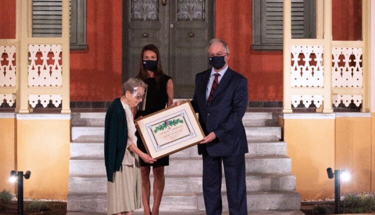 Ο πρόεδρος της Βουλής επέδωσε τιμητική πλακέτα και έπαινο «αξίας και τιμής» στην κυρία Ιωαννίδη ως συμβολική βράβευση για τη δωρεά της Οικίας Μελά στο Υπουργείο Εθνικής Άμυνας, τον Φεβρουάριο του 2020.