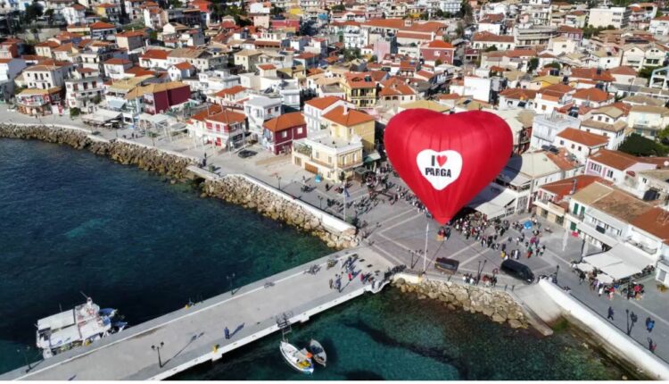 Πλάνα από την εξ ουρανού επίσκεψη του Santa με κατακόκκινο αερόστατο και το σύνθημα «I love Parga»: