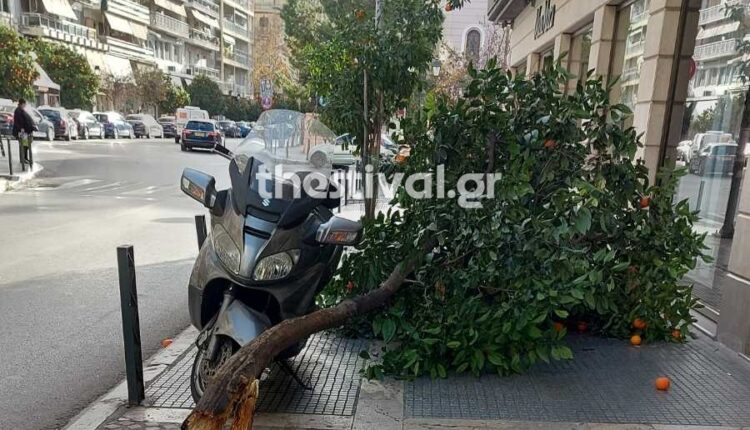 Όπως φαίνεται και στις φωτογραφίες που έστειλε αναγνώστης στο thestival.gr, το δέντρο έχει πέσει μπροστά σε βιτρίνα καταστήματος.