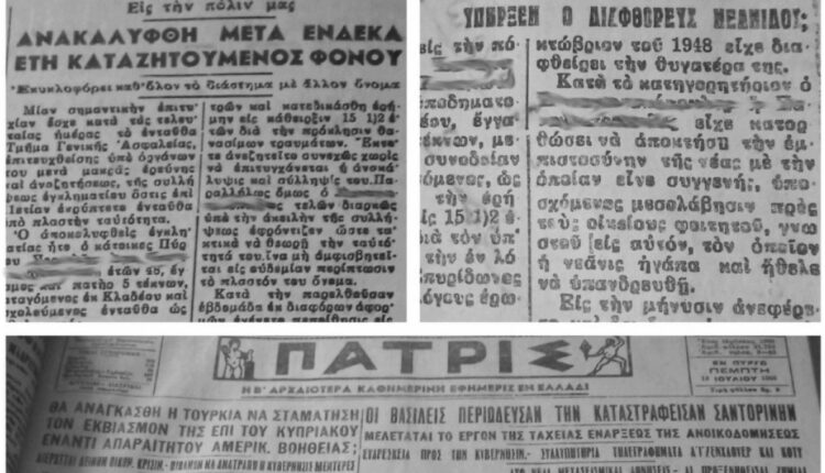 Σύμφωνα με τα δημοσιεύματα της εφ. «Πατρίς», της εποχής, ο 48χρονος Π.Π., κρυβόταν επί 11χρόνια πίσω από ένα άλλο όνομα και μια διαφορετική ταυτότητα. Γιατί το έκανε αυτό; Γιατί το 1945, είχε μεταβεί στην πόλη της Πάτρας, και είχε δολοφονήσει με φαλτσέτα έναν άνδρα.