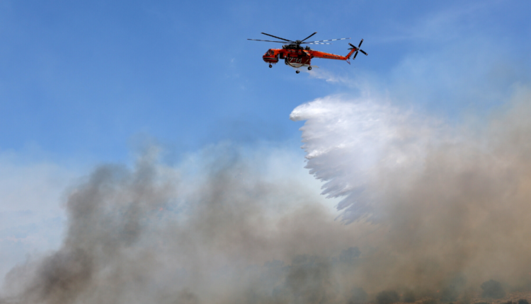 Η φωτιά ενισχύεται κατά περιόδους από τους ανέμους που πνέουν στην περιοχή. Το μέτωπο βρίσκεται κοντά σε σπίτια, χωρίς, όμως, να κινδυνεύουν.