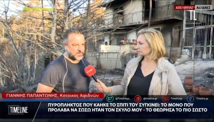 Ενώ εκείνος βοηθούσε να σβήσουν οι φωτιές, το σπίτι του κάηκε. Το μόνο που κατάφερε να σώσει ήταν ο σκύλος του.
