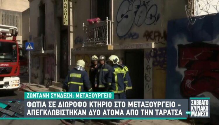 Share Οι πυροσβεστικές δυνάμεις κατάφεραν να απεγκλωβίσουν δύο άτομα από την ταράτσα διώροφου κτιρίου. Νωρίτερα σήμερα είχε σημάνει συναγερμός στην Πυροσβεστική λόγω φωτιάς σε εγκαταλελειμμένο διώροφο κτίριο στο κέντρο Αθήνας επί των οδών Μαιζώνος Ακομινάτου. κτίριομεταξουργείοΦωτιά