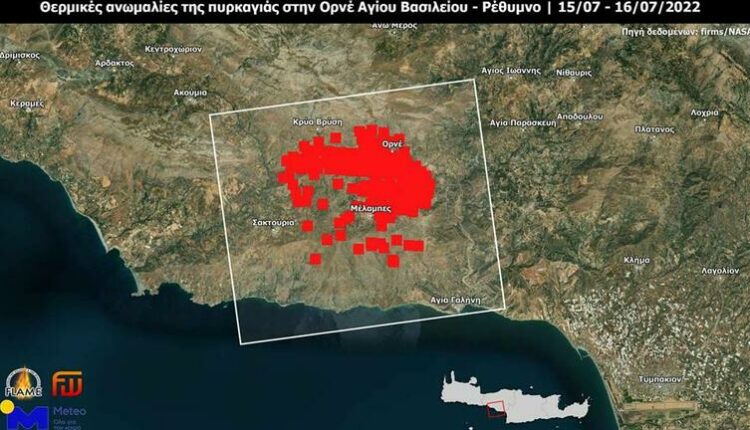 Στον παρακάτω χάρτη που ετοίμασε και παρουσιάζει το Meteo.gr. παρουσιάζονται οι θερμικές ανωμαλίες στο έδαφος όπως καταγράφηκαν από δορυφόρους το βράδυ της Παρασκευής 15/7 και το Σάββατο 16/7.