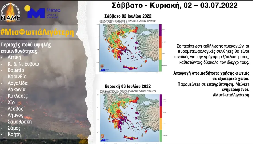 Σε ό,τι αφορά στις περιοχές που αναμένεται να βρεθούν στη ζώνη πολύ υψηλής επικινδυνότητας κατά τη διάρκεια του Σαββατοκύριακου 02 – 03 Ιουλίου 2022, αυτές περιλαμβάνουν την Αττική, την Κ. και Ν. Εύβοια, τμήματα της Βοιωτίας, την Κορινθία, την Αργολίδα, τη Λακωνία, τις Κυκλάδες, τη Χίο, τη Λέσβο, τη Λήμνο, τη Σαμοθράκη, την Αν. Σάμο και τη Ν. Κρήτη.