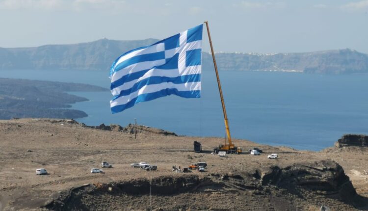 Η μεγαλύτερη σημαία στην ελληνική επικράτεια έκανε την εμφάνισή της σήμερα το πρωί στην Σαντορίνη, ανήμερα της εθνικής μάς επετείου.