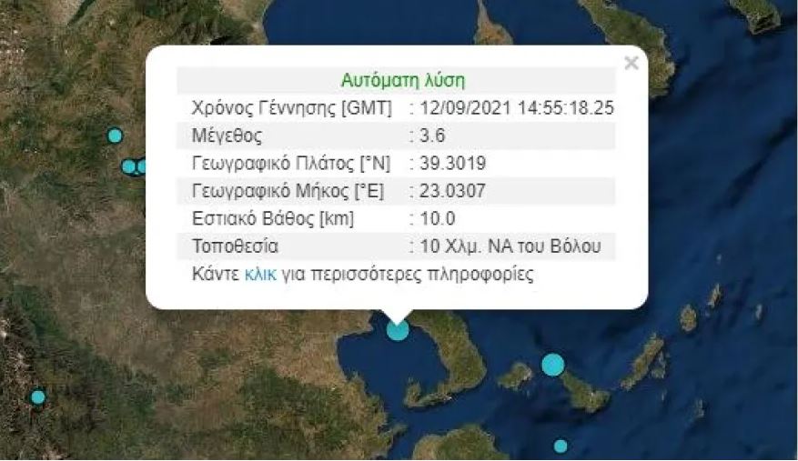 Σεισμική δόνηση στον Βόλο κατέγραψε το Γεωδυναμικό Ινστιτούτο του Εθνικού Αστεροσκοπείου Αθηνών στις 17:55 το απόγευμα της Κυριακής (12.09.2021).
