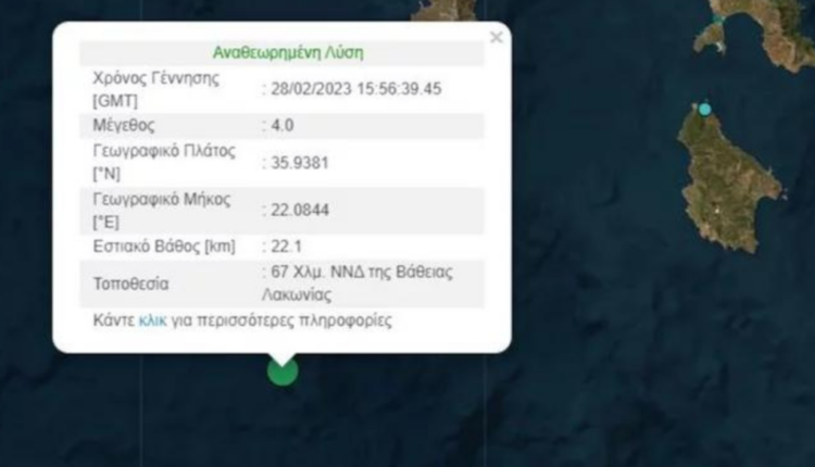 Σύμφωνα με το Γεωδυναμικό Ινστιτούτο Αθηνών, ο σεισμός σημειώθηκε στις 17:56 ώρα Ελλάδος, με επίκεντρο θαλάσσια περιοχή 67 χιλιόμετρα νοτιοδυτικά της Λακωνίας.