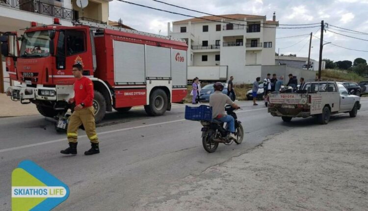 Νεαρή οδηγός μηχανής έχασε τον έλεγχο του δίκυκλου και σφηνώθηκε στους μπροστινούς τροχούς πυροσβεστικού οχήματος στον περιφερειακό δρόμο Σκιάθος- Κουκουναριές, λίγο μετά τις 9 το πρωί.