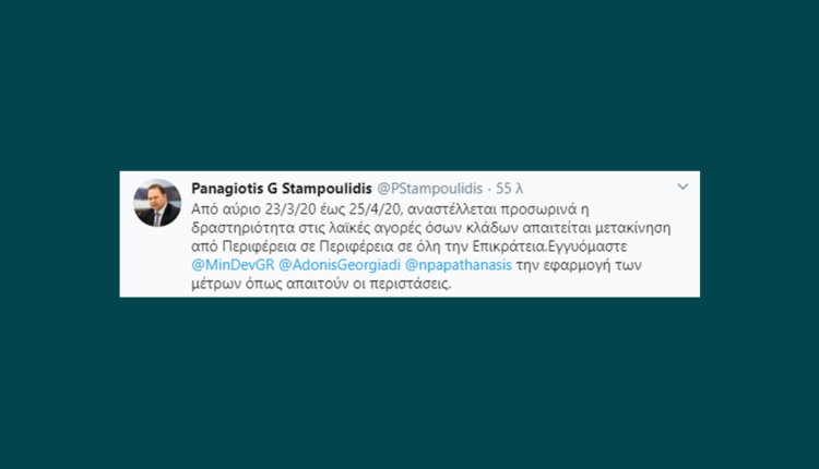 Συγκεκριμένα, ο κ. Σταμπουλίδης έγραψε: “Από αύριο 23/3/20 έως 25/4/20, αναστέλλεται προσωρινά η δραστηριότητα στις λαϊκές αγορές όσων κλάδων απαιτείται μετακίνηση από Περιφέρεια σε Περιφέρεια σε όλη την Επικράτεια.Εγγυόμαστε @MinDevGR, @AdonisGeorgiadi, @npapathanasis την εφαρμογή των μέτρων όπως απαιτούν οι περιστάσεις”.