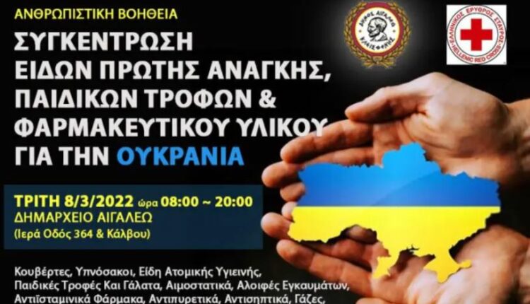 Ο Δήμος Αιγάλεω με ευαισθησία και αλληλεγγύη στέκεται στο πλευρό του λαού της Ουκρανίας και σε συνεργασία με τον Ελληνικό Ερυθρό Σταυρό διοργανώνει δράση συγκέντρωσης ανθρωπιστικής βοήθειας.